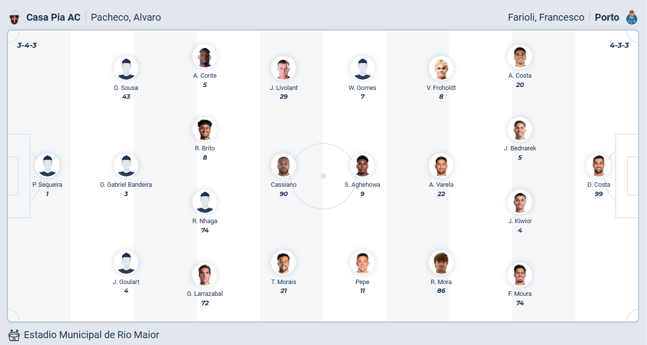 Casa Pia đang đứng thứ 16 trên bảng xếp hạng, vị trí có nguy cơ phải xuống hạng vào cuối mùa. Rõ ràng đội bóng của HLV Álvaro Pacheco đang chơi rất tệ so với vị trí thứ 9 mùa giải trước, điều đó thể hiên ở chuỗi 4 trận liên tiếp không thắng vừa qua. Muốn trụ hạng thì các cầu thủ Casa Pia cần chơi tốt hơn, họ muốn có một chiến thắng ở vòng đấu thứ 20. Tuy nhiên trước đối thủ rất mạnh như Porto thì xem ra cơ hội có điểm không cao, nhiều khả năng lợi thế sân nhà là chưa đủ để Casa Pia có điểm.